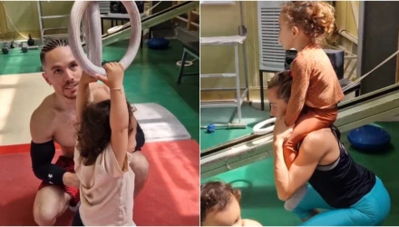 Η αθλήτρια της ενόργανης γυμναστικής ανέβασε μέσα από τον προσωπικό της λογαριασμό στο Instagram, ένα βίντεο, όπου τόσο η ίδια όσο και ο χρυσός oλυμπιονίκης των κρίκων, κάνουν τις ασκήσεις τους, κρατώντας στην αγκαλιά τους τις μικρές Σοφία και Ελένη.