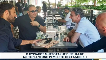 Έναν καφέ με τον γνωστό τραγουδιστή Αντώνη Ρέμο και τον παραολυμπιονίκη και αξιωματικό της ΕΛΑΣ, Αντώνη Τσαπατάκη, ήπιε ο πρόεδρος της Νέας Δημοκρατίας, Κυριάκος Μητσοτάκης, σε γνωστό καφέ επί της Παλαιών Πατρών Γερμανού, στη Θεσσαλονίκη.