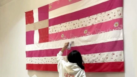 Ανάμεσα στα έργα είναι και η ελληνική σημαία φτιαγμένη από σεντόνια κρεβατιών γυναικών από την Ελλάδα. Η σημαία έχει το ροζ χρώμα. Η νεαρή Ελληνίδα εικαστικός μέσα από τη ροζ σημαία από σεντόνια συμπυκνώνει τη φωνή των Ελληνίδων γυναικών.