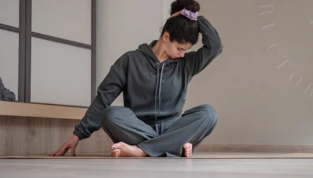Κάθισε στην θέση οκλαδόν και κράτησε τους ώμους μακριά από τα αυτιά. Φέρε την δεξιά παλάμη πάνω στην αριστερή μεριά του κεφαλιού μαλακά, χωρίς να τραβάς. Μείνε για 5 αναπνοές.