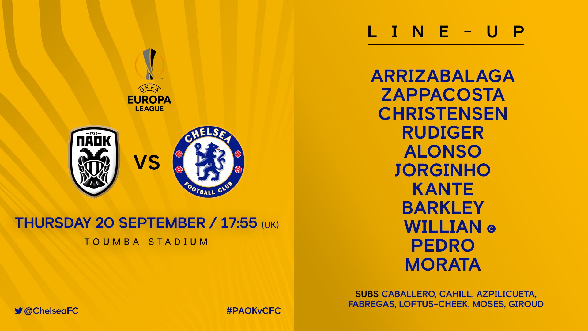 Στην αριστερή πτέρυγα της επίθεσης θα αγωνιστεί ο Πέδρο, στη δεξιά ο Γουίλιαν και στην κορυφή ο Μοράτα.