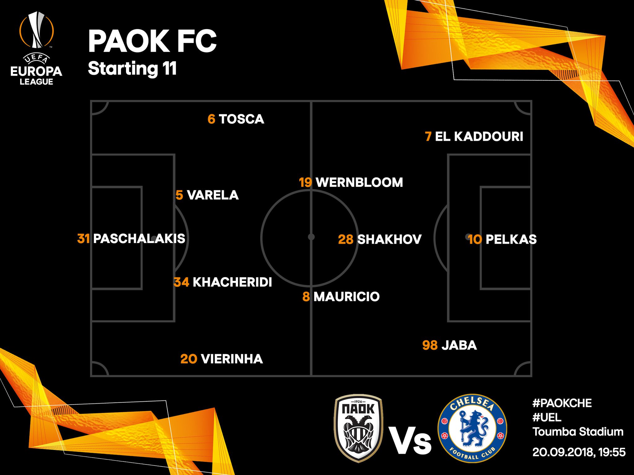 Ο Ρουμάνος τεχνικός των «ασπρόμαυρων» επέλεξε για τον αγώνα κόντρα στην Τσέλσι τον Πασχαλάκη κάτω από τα δοκάρια. Στην άμυνα από τα αριστερά προς τα δεξιά θα αγωνιστούν οι Τόσκα, Βαρέλα, Χατσερίντι και Βιεϊρίνια. Στο χώρο του κέντρου θα βρεθούν οι Βέρνμπλουμ, Μαουρίτσιο και Σάκχοφ πιο μπροστά τους. Στην επίθεση της ομάδας θα παίξουν οι Καντουρί και Ζαμπά στα άκρα και Πέλκας στην κορυφή.