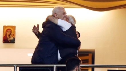 Ο Ιβάν Σαββίδης φορώντας τη νέα ασπρόμαυρη φανέλα του ΠΑΟΚ, υποδέχτηκε τον Δημήτρη Μελισσανίδη στη σουίτα του, όπου παρακολουθούν μαζί τον αγώνα.