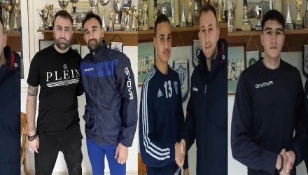 Στις φωτό 1), 2) και 3) Ο τεχνικός διευθυντής των Κυανολεύκων Μιχάλης Τσολακίδης καλοσωρίζει τους νεαποκτηθέντες ποδοσφαιριστές Δ. Κουκουλέκη, Α. Σειταρίδη και Β. Καμπά .