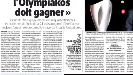 Μία φράση από την κατάθεση του Πέτρου Κωνσταντινέα που αναφέρει «Άκουσε αύριο ο Ολυμπιακός πρέπει να νικήσει» χρησιμοποιεί ως άξονά της η γαλλική εφημερίδα «L' Equipe» σε εκτενές ρεπορτάζ της για το θέμα των στημένων αγώνων στην Ελλάδα.