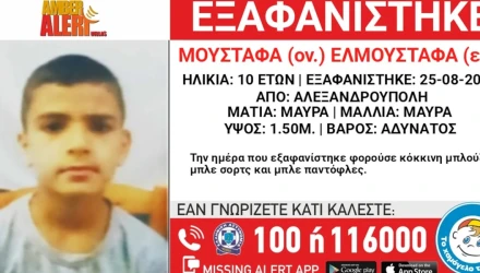 Όπως ανακοίνωσε το «Χαμόγελο του Παιδιού», ο 10χρονος Μουσταφά, συριακής καταγωγής, εξαφανίστηκε από χώρο παιδικής προστασίας στην Αλεξανδρούπολη, το απόγευμα της 25ης Αυγούστου.
