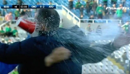 Το ΑΠΟΕΛ ξεκίνησε τα play-offs τίτλου με νίκη επί της Ομόνοιας στο "ΓΣΠ", με οπαδό του "τριφυλλιού" να πετυχαίνει στο κεφάλι τον Γιώργο Δώνη με ποτήρι γεμάτο νερό, όταν πανηγύριζε το 0-2.