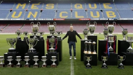 *Ο Αντρές Ινιέστα ποζάρει με τους 32 τίτλους που κέρδισε με την Μπάρτσα
