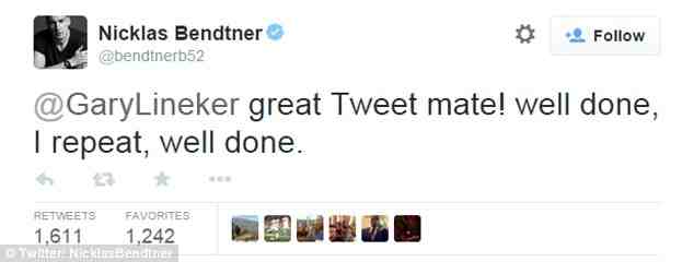 Ο Δανός σέντερ φορ ενημερώθηκε λίγα λεπτά αργότερα για την παραπάνω ατάκα του Λίνεκερ και σε ήρεμο ύφος- αν και οι περισσότεροι περίμεναν την... έκρηξη- του απάντησε: «Πολύ καλό Tweet φίλε. Μπράβο. Επαναλαμβάνω, μπράβο»!