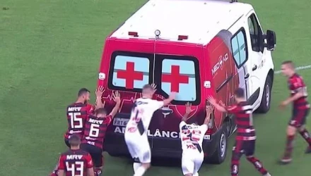 Το ασθενοφόρο μπήκε στο γήπεδο για να μεταφέρει τον Μπρούνο, όμως αυτό που θα ακολουθούσε, κανείς δεν το περίμενε. Το ασθενοφόρο δεν μπορούσε να πάρει μπρος και την κατάσταση πήραν στα χέρια τους οι παίκτες των δύο ομάδων. Πραγματικά τραγελαφικές καταστάσεις που τελικά δεν συμβαίνουν μόνο στη χώρα μας. Όπως θα δείτε στο βίντεο χρειάστηκε να βάλουν ένα χεράκι και οι παίκτες των δύο ομάδων προκειμένου το ασθενοφόρο να ξεκινήσει.