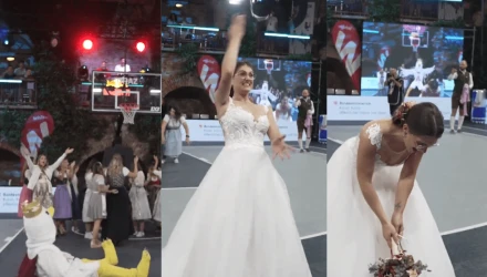 Το ζευγάρι εμφανίστηκε στο 3 επί 3 της FIBA ωστόσο την ώρα που η νύφη θέλησε να δει ποια φίλη της θα ακολουθήσει σε σειρά... παντρειάς, ωστόσο αντί για μία υποψήφια νύφη η ανθοδέσμη μπήκε καλάθι με την ίδια να σκοράρει πίσω από τη γραμμή των 6μ.75.