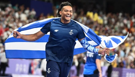 Το κοντάρι έφυγε από τα χέρια του λόγω της ολίσθησης, που προκάλεσε η βροχή στο ταρτάν, ωστόσο ο Καραλής αντέδρασε με χιούμορ.