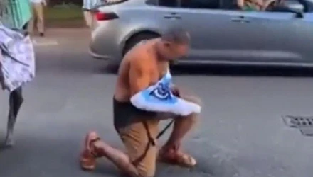 Ο άστεγος άνδρας πλέον έγινε ένα με την γιορτή και συγκινημένος, γονάτισε με τον κόσμο να σπεύδει να τον αγκαλιάσει δίνοντας του κουράγιο αλλά και λόγο να χαρεί και να πανηγυρίσει μαζί τους.