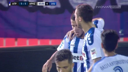 Μετά από το σουτ του Κουλούρη και την απόκρουση του Κουέστα με τα πόδια, ο Σπιριντόνοβιτς πλάσαρε σωστά στην κενή εστία στέλνοντας τις δύο ομάδες ισόπαλες 1-1 στα αποδυτήρια για την ανάπαυλα.