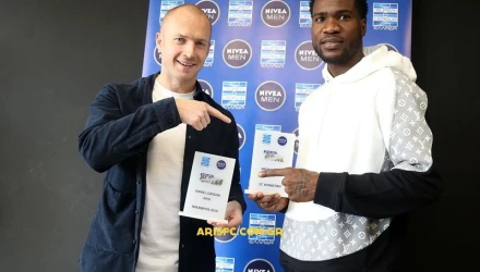 O Daniel Larsson, ποδοσφαιριστής του μήνα (Νοέμβριος) και ο Brown Ideye, NIVEA MEN Best Goal της 15ης αγωνιστικής και η σημερινή βράβευσή τους στην αίθουσα Τύπου του Κλεάνθης Βικελίδης από τους παλαίμαχους ποδοσφαιριστές της ομάδας μας, Παναγιώτη Κατσιαρό και Γιώργο Γκουγκουλιά αντίστοιχα, σε συνεργασία με την εκπρόσωπο της NIVEA, κ. Τάνια Μαϊμάρη και τον κ. Σταύρο Μακουλίδη, Διευθυντή αγορών της «Μασούτης»-NIVEA.