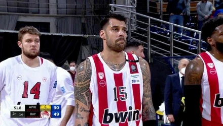 Ο αρχηγός του Ολυμπιακού, Γιώργος Πρίντεζης, εμφανίστηκε φανερά συγκινημένος και βούρκωσε γυρνώντας προς τον πάγκο της ομάδας του.