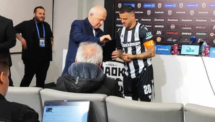 Στην αίθουσα Τύπου Θανάσης Κατσαρής και Θανάσης Χατζόπουλος τίμησαν τον Αντρέ Βιεϊρίνια για την προσφορά του στην ομάδα για λογαριασμό του ΑΣ και της ΚΑΕ ΠΑΟΚ αντίστοιχα.