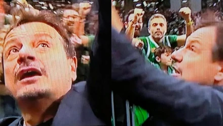 Αποχωρώντας από το παρκέ έσφιξε τις γροθιές του και έδειξε προς τους δημοσιογράφους το λάβαρο του 7ου ευρωπαϊκού τίτλου. Στη συνέχεια, μετά το flash interview και πηγαίνοντας προς τα αποδυτήρια του ΟΑΚΑ, ο προπονητής του Παναθηναϊκού ξέσπασε κατά μερίδας των ΜΜΕ.