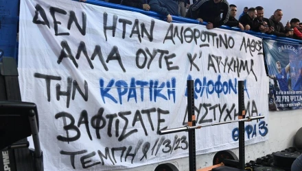 Το πανό έγινε αιτία να καθυστερήσει το τζάμπολ στην αναμέτρηση, με τον κομισάριο να ζητά να κατέβει, αλλά τους οργανωμένους φίλους του Ιωνικού να αρνούνται, φωνάζοντας: «Δεν θα κατέβει το πανό». Απίστευτο και όμως ελληνικό. Ο κομισάριος να ζητά να κατέβει ένα πανό που αφορά μια τέτοια τραγωδία στη χώρα μας.