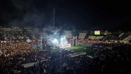 Εκεί ήταν έτοιμη μια σκηνή για να πανηγυρίσει η ομάδα με τον κόσμο και να γίνεται ένας πραγματικός χαμός στις κερκίδες που γεμίζουν σταδιακά.