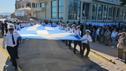 Τη σημαία μετέφεραν με πομπή, στον χώρο της έπαρσης οι σπουδαστές της ΑΕΝ Μηχανικών Χίου με τη Φιλαρμονική του Δήμου Χίου να παιανίζει στρατιωτικά εμβατήρια.