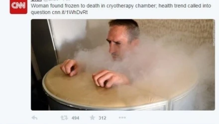 Συγκεκριμένα, η είδηση ότι μια γυναίκα βρέθηκε νεκρή κατά τη συνεδρία κρυοθεραπείας, ήρθε στο «προσκήνιο» με φωτογραφία του παίκτη των Βαυαρών, ο οποίος έκανε κρυοθεραπεία -ολοζώντανος εννοείται- πριν λίγα χρόνια, στο Ευρωπαϊκό πρωτάθλημα του 2012.