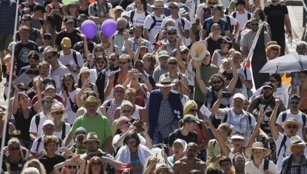Με συνθήματα όπως «Εμείς είμαστε το δεύτερο κύμα» και «Αντίσταση», δεκάδες χιλιάδες αρνητές των περιορισμών που επιβάλλονται για την αποτροπή εξάπλωσης της πανδημίας, εξέφρασαν την αντίθεσή τους στις σχετικές αποφάσεις της πολιτείας. Ελάχιστοι από τους διαδηλωτές φορούσαν προστατευτικές μάσκες, ενώ δεν τηρήθηκαν οι προβλεπόμενες αποστάσεις ασφαλείας.