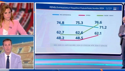 Την πρόθεση ψήφου ενόψει ευρωεκλογών, τη συσπείρωση και τις διαρροές των ψηφοφόρων των κομμάτων, τη δημοτικότητα των πολιτικών αρχηγών, την αντιμετώπιση των θεμάτων της οικονομίας, της καθημερινότητας, της εξωτερικής πολιτικής και της Δικαιοσύνης, αλλά και ποια είναι τα σημαντικότερα προβλήματα, που αντιμετωπίζουν οι πολίτες, ανέλυσε ο Δημήτρης Μαύρος με τον Παναγιώτη Στάθη στο δεύτερο μέρος της μεγάλης δημοσκόπησης της MRB για το OPEN.