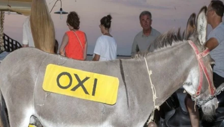 Ένας γάιδαρος με ξεκάθαρη πολιτική άποψη έκλεψε την παράσταση στη Λευκάδα και μαζί τα βλέμματα και τη... φωτογράφηαη από δεκάδες τουρίστες.