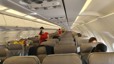 Ολοι οι επιβαίνοντες στο αεροπλάνο περιμένουν υπομονετικά καθώς υπάρχει μια διαδικασία που πρέπει να τηρηθεί. Ενας υγειονομικός υπάλληλος ετοιμάζεται να θερμομετρήσει όσους βρίσκονται στο αεροσκάφος προτού τους επιτρέψει την αποβίβαση. Τα μέτρα για τον κορωνοϊό είναι πολύ αυστηρά, παίκτες και μέλη της αποστολής κρατούν στο χέρι τα αρνητικά τεστ για να τα δείξουν στον υγειονομικό υπάλληλο όπως και την ειδική αίτηση.