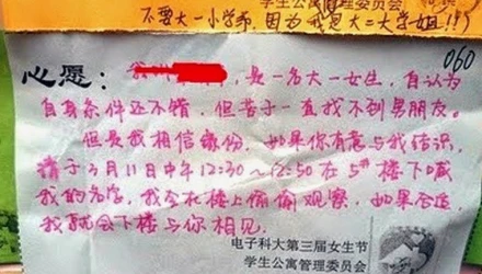 «Είμαι η Zhang και νομίζω πως είμαι όμορφη, αλλά δεν μπορώ να βρω κάποιον να με αγαπήσει. Όμως πιστεύω στη μοίρα και περιμένω να πραγματοποιηθεί η ευχή μου – ένα αγόρι να έρθει κάτω από το παράθυρό μου και να φωνάξει το όνομά μου! Αν θέλεις, θα σε περιμένω στις 11 Μαρτίου. Φώναξέ με και θα σε βάλω κρυφά στο δωμάτιο στην εστία μου».
