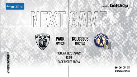 Στον αγώνα ΠΑΟΚ mateco – Κολοσσός H Hotels, που θα διεξαχθεί στο PAOK Sports Arena την Κυριακή 2 Ιανουαρίου 2022 στις 17:00, η είσοδος θα επιτραπεί μόνο σε κατόχους εισιτηρίων διαρκείας της αγωνιστικής περιόδου 2021-22 και μέχρι την συμπλήρωση του επιτρεπόμενου αριθμού θεατών (10% της χωρητικότητας), σύμφωνα με τα νέα μέτρα που εξαγγέλθηκαν από την Κυβέρνηση.