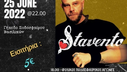 Το πρόγραμμα του 1ου Φεστιβάλ Αθλητισμού και Νεολαίας Βασιλικών ολοκληρώνεται το βράδυ με τη συναυλία του Stavento τον οποίο θα συνοδεύει η Ιόλη Πενταρά.