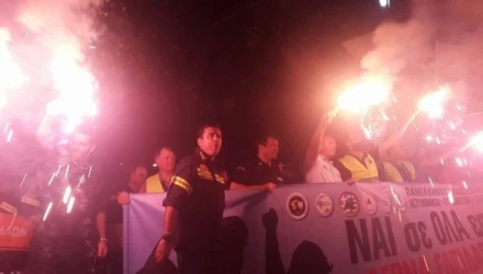 Αυτή την ώρα οι ένστολοι φωνάζουν συνθήματα, ανάβουν πυρσούς, κρατώντας πανό και μαύρα μπαλόνια στα χέρια.