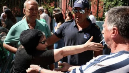 Η Ελένη Λουκά, περίμενε την κυρία Γεννηματά έξω από το εκλογικό κέντρο και αφότου φώναξε συνθήματα αποχώρησε.