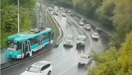A brake failure on the public transport caused it to take a bend at high speed before it ploughed into another tram further along the line in Kemerovo, Siberia.