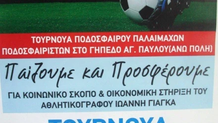Τουρνουά παλαιμάχων για την ενίσχυση του αθλητικογράφου Γιάννη Γιάγκα θα γίνει την Δευτέρα και την Τετάρτη στο γήπεδο Αγίου Παύλου το οποίο διοργανώνει ο Αντώνης Καπούλας.