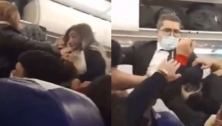Οι επιβάτες ωστόσο συνέχιζαν απτόητοι να καβγαδίζουν και κάποια στιγμή, όπως φαίνεται στο βίντεο, ένας άνδρας τραβάει μία γυναίκα από τα μαλλιά και έπειτα τη χτυπάει με γροθιές στο κεφάλι.