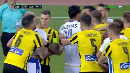 Περίπου τρία λεπτά μετά την έναρξη του δεύτερου μέρους και σε μία διεκδίκηση της μπάλας, ο αμυντικός της «Ένωσης» και ο επιθετικός των Αρκάδων άρχισαν να ανταλλάζουν… αγκωνιές, με τον Αργεντινό στη συνέχεια να ρίχνει και μπουνιά στον διεθνή στόπερ.