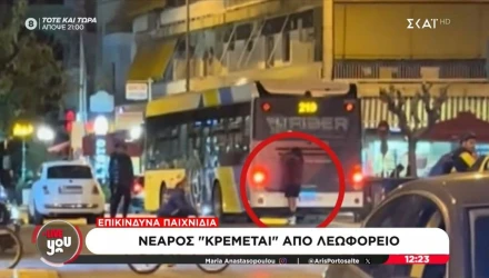 Νέο βίντεο που ήρθε στη δημοσιότητα, δείχνει έναν νεαρό να κρεμιέται από το πίσω μέρος ενός λεωφορείου κάνοντας κανονικά τη... διαδρομή, αλλά με «άγνωστο» προορισμό. Αρχικά, ο... κασκαντέρ ξεκινά να κινείται με πατίνι και να πλησιάζει το λεωφορείο, έχοντας ως σκοπό να βρεθεί ανέβει στο πίσω μέρος του. Στη συνέχεια, γαντζώνεται από τον αεραγωγό και συνεχίζει να κινείται, θέτοντας εαυτόν σε κίνδυνο. Το περιστατικό καταγράφηκε στην Καλλιθέας στην Αθήνα, κοντά στη Σιβιτανίδειο σχολή στο Μοσχάτο.