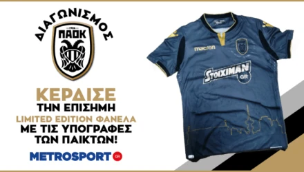 Μπες στο metrosport.gr, συμπλήρωσε τα στοιχεία σου (απαραίτητα όλα τα στοιχεία), απάντησε σωστά στην ερώτηση, μπές στην κλήρωση και κέρδισε την επίσημη limited edition φανέλα ΠΑΟΚ με τις γνήσιες υπογραφές των παικτών.