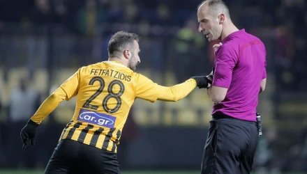 Ο διαιτητής Καραντώνης έχασε κατά κράτος τη μάχη με τον πειθαρχικό έλεγχο. Ανέχτηκε το παραβατικό παιχνίδι των παικτών της ΑΕΚ, δεν έκανε τον κόπο να πάει μέχρι το μόνιτορ για να έχει προσωπική άποψη για τη φάση της ανατροπής του Φετφατζίδη και δίστασε να αποβάλει έναν εκ των Σβάρνα, Βράνιες και Σιμάνσκι οι οποίοι είχαν κίτρινες κάρτες από το α’ ημίχρονο. Οι τρεις παίκτες της ΑΕΚ έπαιξαν πολλές φορές στο υπόλοιπο διάστημα αντιαθλητικά τους αντιπάλους τους κάτω από την ανοχή του Καραντώνη. Ενδεικτικό του τρόπου που η ΑΕΚ επιχείρησε να επιβιώσει είναι τα 33 συνολικά σε βάρος της φάουλ. Και λίγα όμως ήταν. Οι αποφάσεις του διαιτητή εκνεύρισαν τους παίκτες του Αρη κι αυτό ήταν το δεύτερο κακό που προξένησε στους “κίτρινους” ο Καραντώνης.