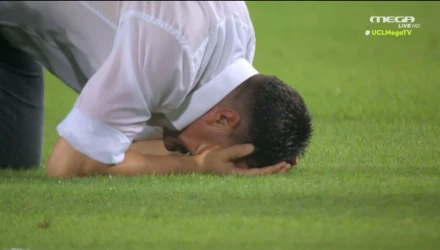 Αφού, λοιπόν, έδινε... χέρια σε παίκτες και συνεργάτες, σήκωνε γροθιές, κάποια στιγμή γονάτισε, έβαλε τα χέρια στο πρόσωπό του και ακούμπησε στο χορτάρι.