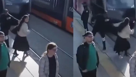 Λίγα κλάσματα του δευτερολέπτου παραπάνω, και αυτή η γυναίκα στην Τουρκία θα είχε βρεθεί κάτω από τις γραμμές του τραμ, αν δεν ήταν η σωτήρια παρέμβαση ενός φύλακα «αγγέλου», που την τράβηξε πίσω.