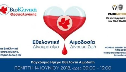 Η Βιοκλινική Θεσσαλονίκης, με τη συνεργασία της ΠΑΕ ΠΑΟΚ (PAOK Action) διοργανώνει ΕΘΕΛΟΝΤΙΚΗ ΑΙΜΟΔΟΣΙΑ στις εγκαταστάσεις της (Μητροπόλεως 86, Κέντρο Θεσσαλονίκης) την Παγκόσμια Ημέρα Εθελοντή Αιμοδότη, την Πέμπτη 14 Ιουνίου 2018 και ώρες 09:00 – 13:00. Φορέας διενέργειας θα είναι η Μονάδα Αιμοδοσίας του Ιπποκρατείου Νοσοκομείου Θεσσαλονίκης.