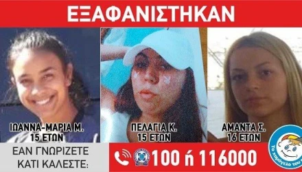 Τρία ανήλικα κορίτσια, ηλικίας 15 ετών τα δύο και 16 το τρίτο, που διέμεναν σε δομή φιλοξενίας στην Αγία Παρασκευή, αγνοούνται από την περασμένη Δευτέρα.