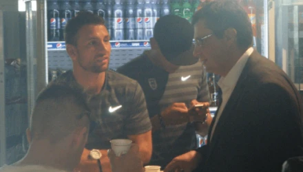 Ο νέος πρόεδρος της ΠΑΕ βρέθηκε από νωρίς στο αεροδρόμιο Μακεδονία και είχε την ευκαιρία να μιλήσει με τον Αναστασιάδη ενώ καθόλη τη διάρκεια της πτήσης μιλούσε με τον Ζήση Βρύζα. Κατά τη διάρκεια της παραμονής της αποστολής στο αεροδρόμιο της Βενετίας ήπιε καφέ με τους ποδοσφαιριστές με τους οποίους ήταν ιδιαίτερα προσιτός και ευχάριστος. Δεν παρέλειψε να χαιρετίσει τους δημοσιογράφους και όταν η αποστολή βρέθηκε στο Λονδίνο, δεν έκρυψε τη χαρά του αφού εδώ σπούδασε και ξέρει πολύ καλά την πρωτεύουσα της Αγγλίας.