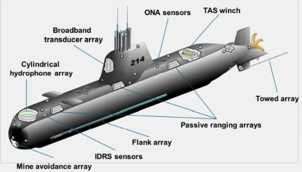Εδώ βρίσκεται το όριο: το Type 214 NG δεν είναι Υ/Β «μακράς στρατηγικής παραμονής». Παρουσιάζει εξαιρετικά χαμηλό ίχνος σε χαμηλές ταχύτητες, παθητική παρακολούθηση, πολύ καλή συμπεριφορά, όταν αναφερόμαστε σε ρηχό και πολυστρωματικό περιβάλλον (Αιγαίο). Ρεαλιστικά δεν θεωρείται το κορυφαίο σε υψηλές ταχύτητες, μεγάλα βάθη αλλά και παρατεταμένη καταδίωξη. Από άποψη δε, αισθητήρων και σύστημα Διαχείρισης Μάχης, υπάρχουν τα Sonar Suite (σύνολο όλων των σόναρ + του λογισμικού επεξεργασίας τους, τα οποία λειτουργούν συνδυαστικά., με σκοπό να τροφοδοτούν το CMS) . Διαθέτει bow array (κύριο σόναρ τοποθετημένο στην πλώρη του, μέσα σε ειδικό ακουστικά διαφανές θόλο –(sonar dome). Αυτό λειτουργεί (ακούει) κυρίως παθητικά και δευτερευόντως ενεργά, δηλαδή εκπέμπει, αν χρειαστεί.. Διακρίνουμε επίσης τις flank arrays (μακριές, σταθερές συστοιχίες υδροφώνων τοποθετημένες κατά μήκος των πλευρών του υποβρυχίου. Δεν αποτελούν ένα ενιαίο σόναρ. Είναι δύο “αυτιά” πλήρους μήκους που “ κοιτούν” πλαγίως. Διαθέτει επίσης (περιορισμένων δυνατοτήτων) towed array (ρυμουλκούμενη συστοιχία υδροφώνων) σε μακρύ καλώδιο που σύρεται πίσω από το υποβρύχιο. Αυτή λειτουργεί παθητικά, είναι εξαιρετικά ευαίσθητη σε χαμηλές συχνότητες, και τοποθετείται μακριά από τον θόρυβο του σκάφους.