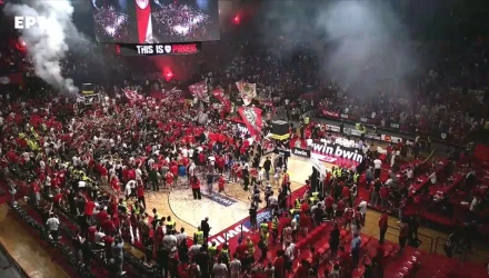 Οι Πειραιώτες γιόρτασαν στο ΣΕΦ την κατάκτηση του τροπαίου μαζί με χιλιάδες οπαδούς τους.