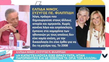 Στο δικαστήριο δεν εμφανίστηκε ούτε η σύζυγος του Πέτρου Φιλιππίδη, Ελπίδα Νίνου, αλλά η εκπομπή «Super Κατερίνα» παρουσίασε μέρος της κατάθεσής της για την υπόθεση βιασμού.«Είχε θρασύτητα, δεν σεβόταν τα όρια»